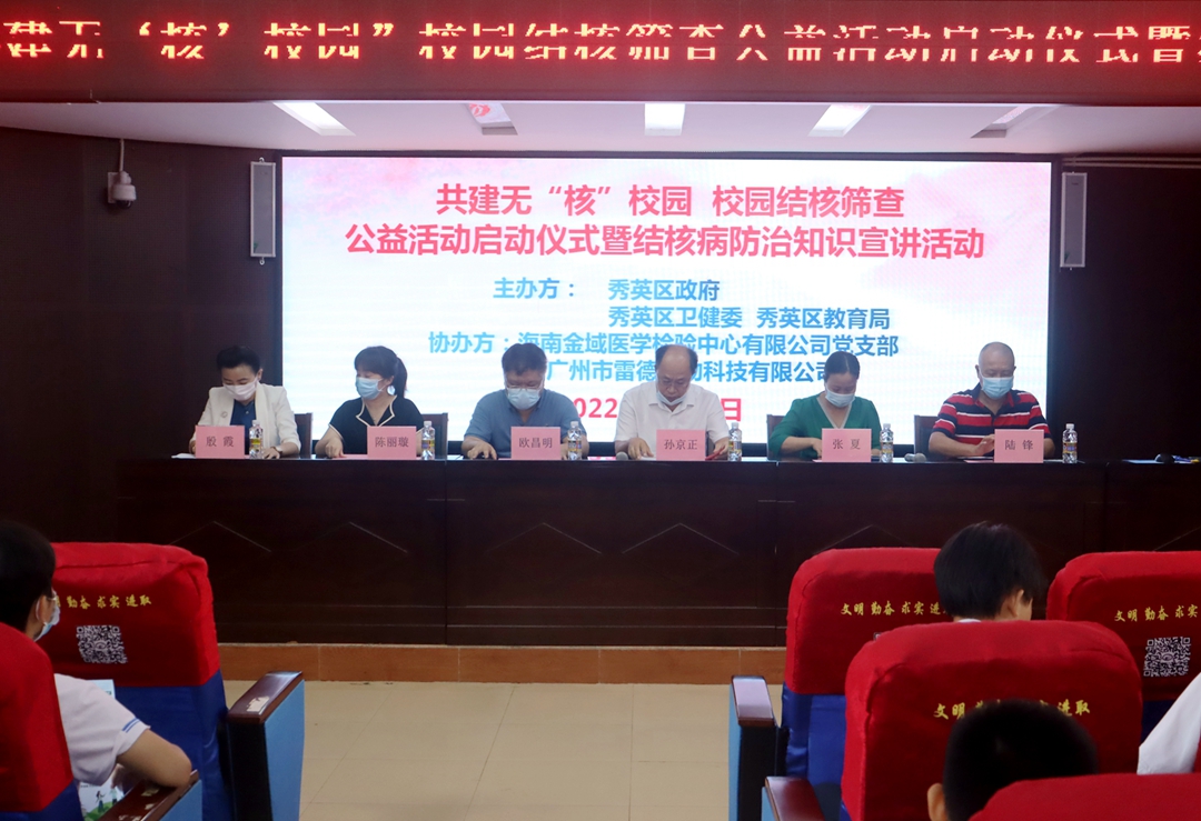 本次活動(dòng)由海南省海口市秀英區(qū)衛(wèi)生健康委員會(huì)和秀英區(qū)教育局統(tǒng)一部署,由廣州市雷德生物科技有限公司(簡稱雷德倍爾)協(xié)辦。秀英區(qū)政府孫京正調(diào)研員、秀英區(qū)教育局張夏主任、秀英區(qū)疾控中心歐昌明主任、海口市第十四中學(xué)陸鋒副校長以及雷德倍爾市場部殷霞主任等相關(guān)領(lǐng)導(dǎo)出席活動(dòng)并發(fā)表講話,??谑械谑闹袑W(xué)100余名師生代表共同參加和見證了公益活動(dòng)啟動(dòng)儀式。