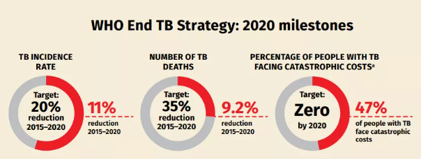 2014年和2015年世界衛(wèi)生組織和聯(lián)合國提出可持續(xù)發(fā)展目標,希望2035年能夠終止結核病的流行,2020是作為里程碑的一年,結核防治結果卻遠遠未達到預期。與2015年相比,2020年結核病發(fā)病率目標是降低20%,目前只降低了11%;結核病的死亡人數(shù)是降低35%,目前只降低了9.2%;由于結核病治療導致家庭經(jīng)濟面對巨大困難的百分比降至0%,目前只達到47%。