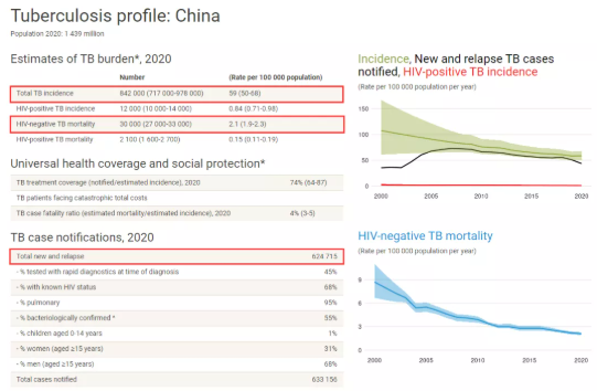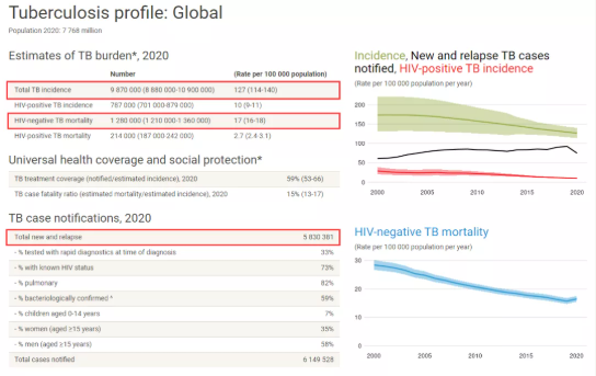 從數(shù)據(jù)來看,2020年,WHO預估全球結核病新發(fā)病例為987萬(發(fā)病率為127/10萬),因結核病死亡(艾滋病陰性患者)的人數(shù)為128萬(死亡率為17/10)。