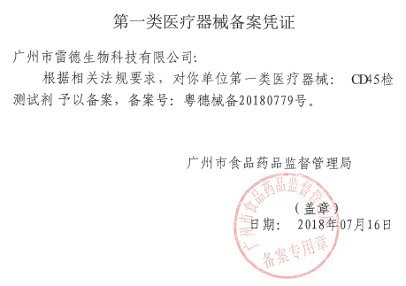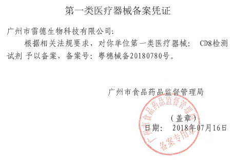 2018年7月16日,我公司自主研發(fā)的4款流式抗體產(chǎn)品“CD3、CD4、CD8、CD45檢測試劑”均通過了廣州市食品藥品監(jiān)督管理局的Ⅰ類醫(yī)療器械產(chǎn)品審批備案,正式獲準(zhǔn)上市銷售。