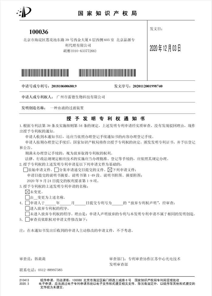 另外獲得授權(quán)的兩件核心技術(shù)發(fā)明專利名稱均為《一種血液的過濾裝置》,申請(qǐng)?zhí)枮榉謩e“201810601221.2”和“201810600680.9”,該兩件發(fā)明陸續(xù)于2020年11月16日與2020年12月03日獲得授權(quán)。